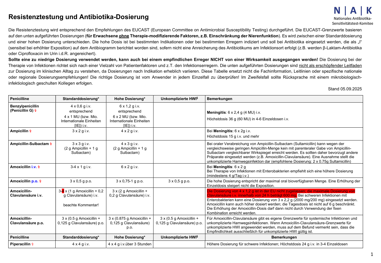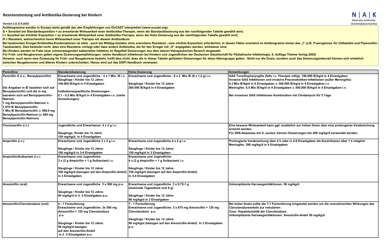 In der EUCAST-Dosierungstabelle 2020, die Standard- und hohe Dosierungen von Antibiotika vorgibt, wurden Empfehlungen zur Antibiotika-Dosierung bei unkomplizierten Harnwegsinfektionen ergänzt. Das Nationale Antibiotika-Sensitivitätstest-Komitee des EUCAST in Deutschland (NAK) hat zusätzlich Empfehlungen für die Dosierung von Antibiotika bei Kindern erstellt (siehe www.nak-Deutschland.org)
